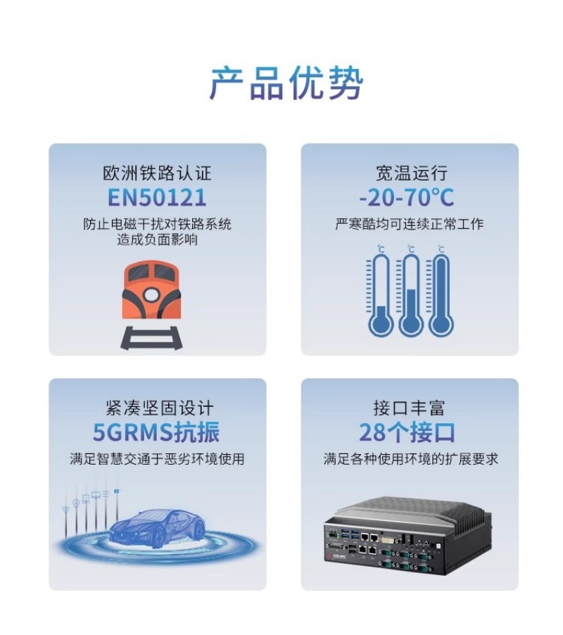 - 場景價值:智慧交通 ETC 車道中,4 個 GbE 網(wǎng)口可同時連接 4 路高清攝像頭,6 個 COM 口對接車道控制器和道閘,8 路隔離 DI/O 監(jiān)控車輛檢測器狀態(tài),無需額外擴展模塊,減少故障點。
