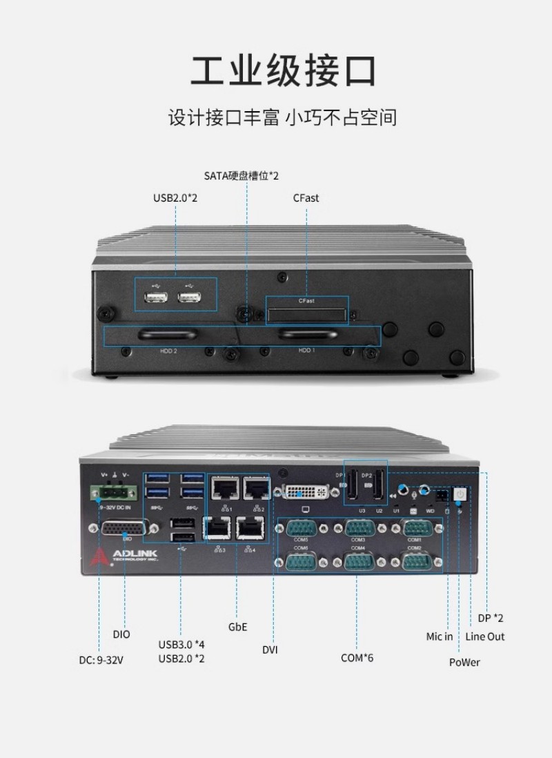 - 參數(shù)硬實力:1x DVI-I+2x DisplayPort 三顯輸出,4x USB 2.0+4x USB 3.0,4x GbE 網(wǎng)口,6x COM 串口,8x 隔離 DI/O——一臺設備滿足攝像頭、傳感器、PLC、顯示屏等所有外設連接。