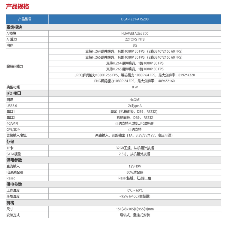 ? 內置華為異騰Atlas 200 Al智能計算模組,集成高性能Ascend 310 Al處理器,多級算力配置(22TOPS INTS或11TOPSFP16)