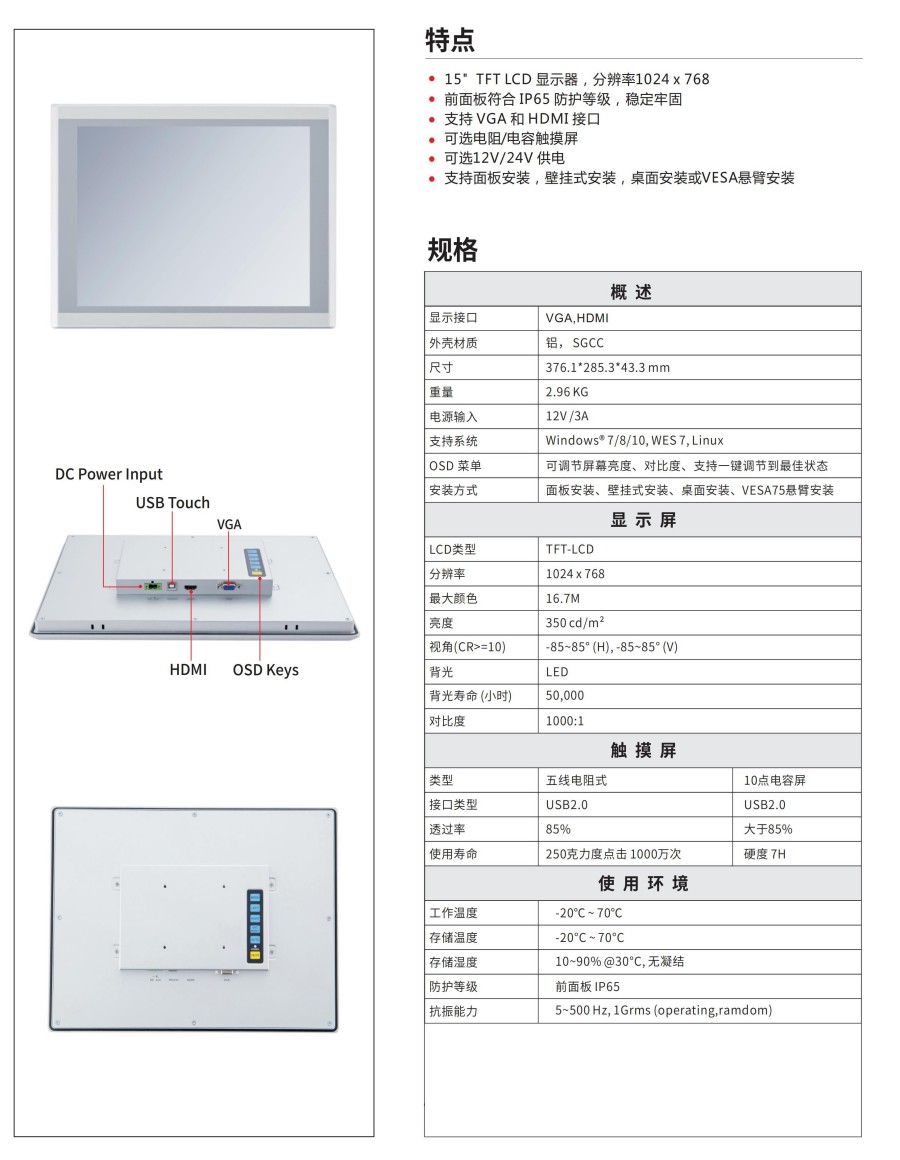 ?15" TFT LCD 顯示器,分辨率1024 x 768